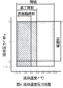 (1) 襯里材料(或直接與介質接觸的測量管) 常用襯里材料有氟塑料、聚氨酯橡膠、氯丁橡膠和陶瓷等。近年有采用高純氧化鋁999.7%AI2O3)陶瓷制成襯里的,但只限中小口徑傳感器。 氯丁橡膠和玻璃鋼用于非腐蝕性或弱腐蝕性液體,如工業(yè)用水、廢污水及弱酸堿,價格*為低廉。氟塑料具有優(yōu)良的耐化學腐蝕性,但耐磨性差,不能用于測量礦漿液。氟塑料中*早應用的是聚四氟乙烯,因與測量管間僅靠壓貼,無粘結力,不能用于負壓管道,后開發(fā)各種改性品種,實現(xiàn)注塑成形,與測量管有較強結合力,可用于負壓, 聚氨酯橡膠有極好的耐磨耗性,但耐酸堿的腐蝕性較差。它的耐磨性相當于天然橡膠的10倍,適用于煤漿、礦漿等;介質溫度要低于40~60/70℃。氧化鋁陶瓷有極好的耐磨耗性和對強酸堿的耐磨腐蝕性,耐磨性約為聚氨酯橡膠的10倍,適用于具有腐蝕性的礦漿;但性脆,安裝夾緊時疏忽易碎,可用于較高溫度(120~140/180℃)但要防止溫度劇變,如通蒸汽**,一般溫度突變不能大于100℃,升溫150℃ 要有10min時間。 通用型EMF幾種材料的壓力溫度大體適用范圍可參閱圖4。 | ![]() |